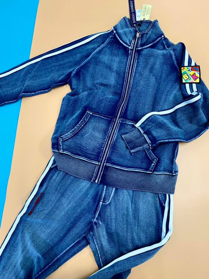 大人な雰囲気を演出するデニムのヴィンテージ感が新しい、デニム風スウェットZIPトラッカー&カットデニムサイドラインパンツの上下セットアップ。